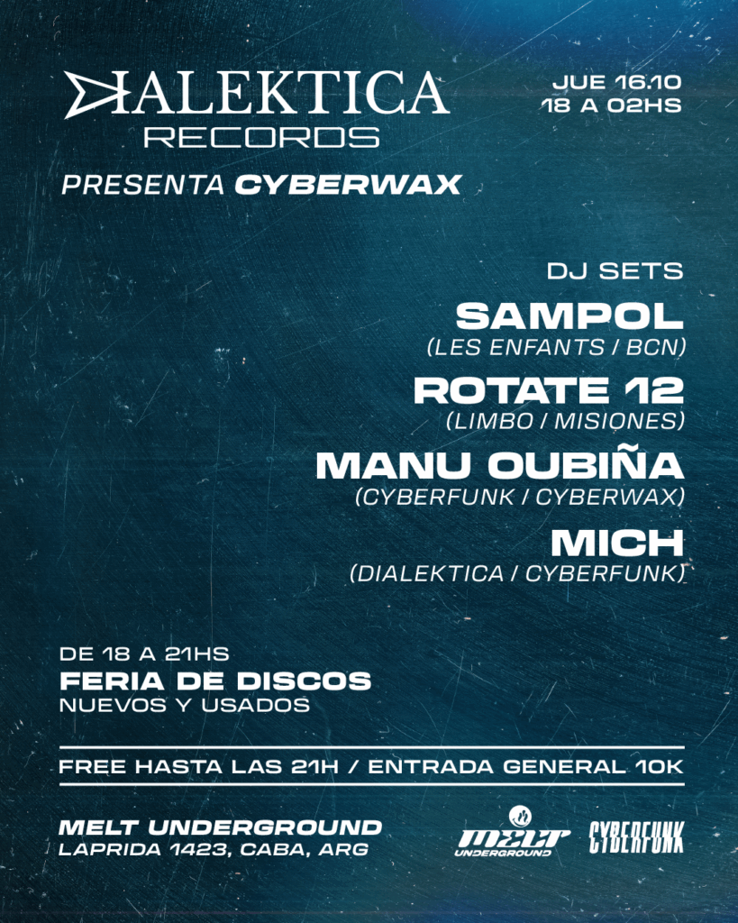 El primer encuentro tendrá lugar este jueves, con una edición especial junto al colectivo Cyberwax, que desembarca con feria de discos —nuevos y usados— y un line-up que une distintas geografías y generaciones. Desde Barcelona llega Sampol, fundador de Checkpoint y residente de Les Enfants Brillants, dos de los proyectos más representativos de la escena catalana actual. Desde Misiones se suma el dúo Rotate 12, responsables del ciclo Limbo, que viene activando la cultura del vinilo en la triple frontera. Completan la noche Mich, anfitrión del ciclo, y Manu Oubiña, curador de Cyberwax y residente de Avant Garten, recién llegado de su gira por Europa.