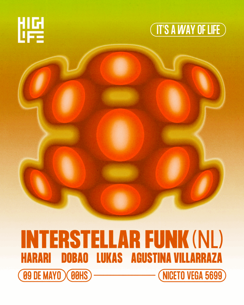 «El viernes 9 de mayo vuelve Highlife con nuestra primera fecha del año, el artista principal de la noche será Interstellar Funk de Países Bajos, residente del festival Dekmantel , DJ y productor que explora los límites del universo electrónico, parte de los sellos Rush Hour Music y LIES Records que nos gustan mucho y seguimos hace años.»
